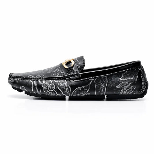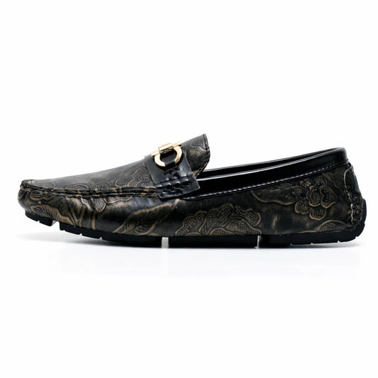 Mocassin Homme Similicuir Noir Fleuri Or