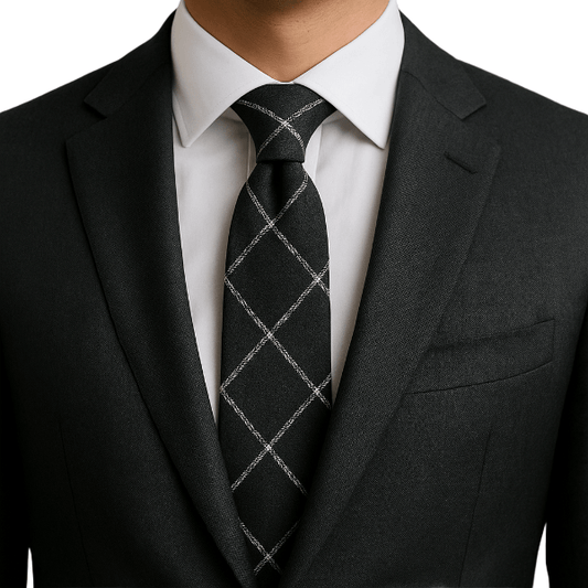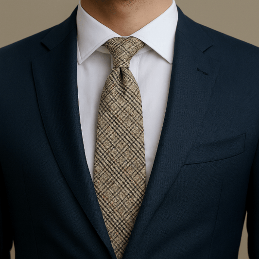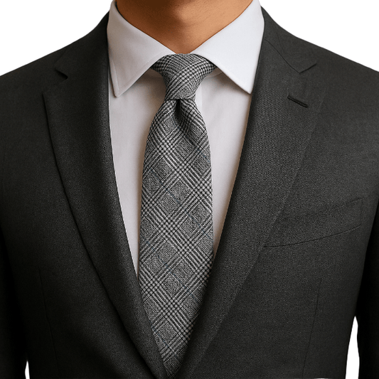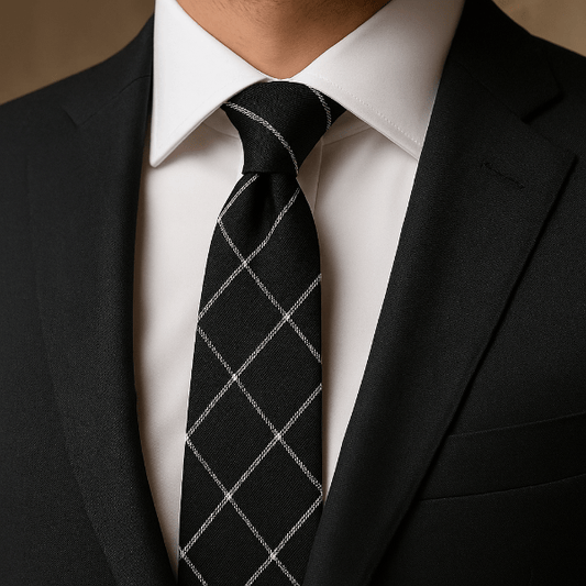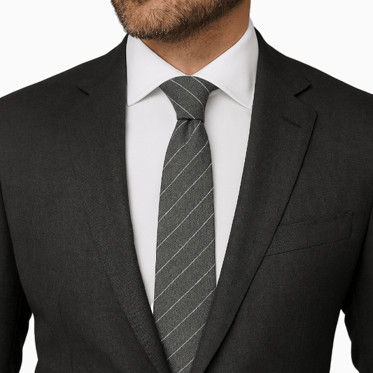 Une cravate bien proportionnée équilibre le col et les revers. Visez une largeur cohérente avec vos revers ; la pointe doit effleurer la boucle de ceinture une fois nouée.