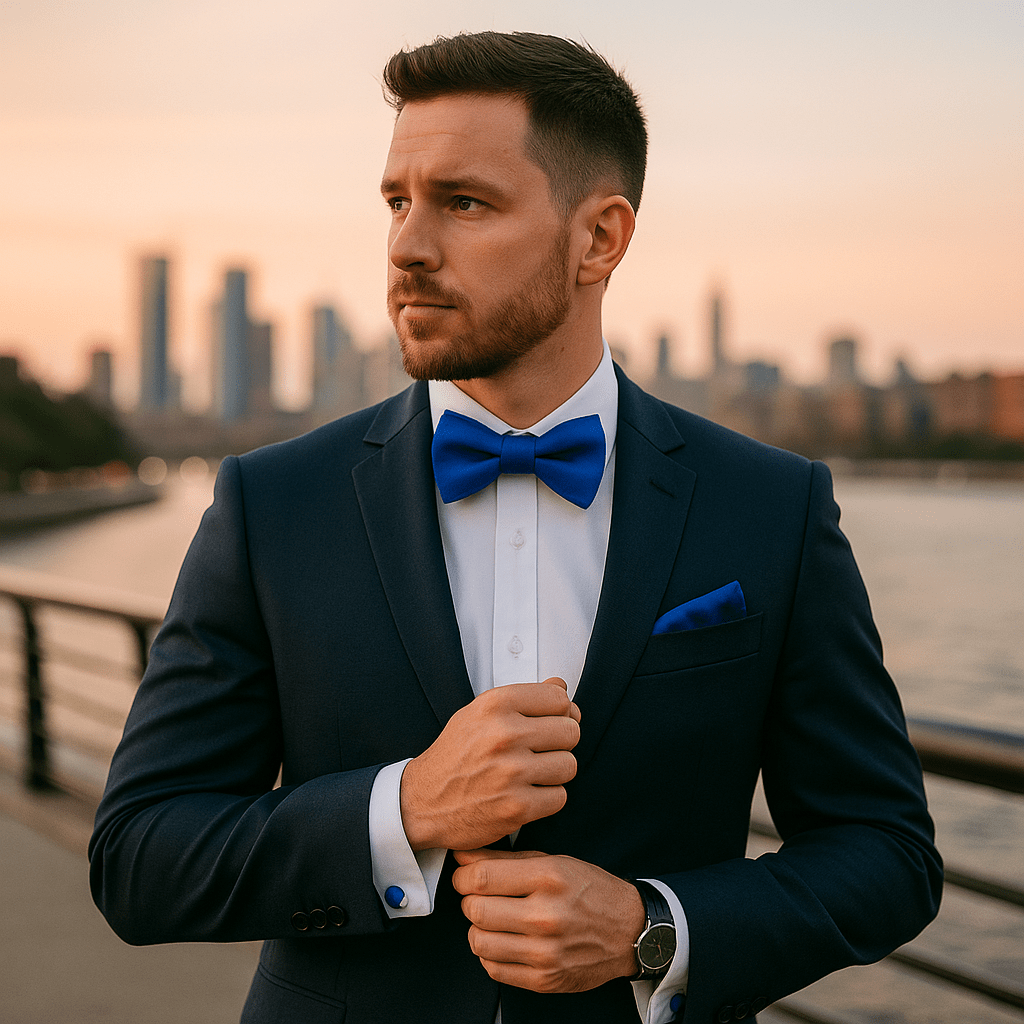 Exprimez votre style avec ce nœud papillon uni en soie, rehaussant votre allure d'une teinte de bleu éclatante. Ajustable pour un confort optimal, il est accompagné de boutons de manchette, d'un mouchoir de costume et d'une broche assortis, ajoutant une touche distinctive à chaque tenue.